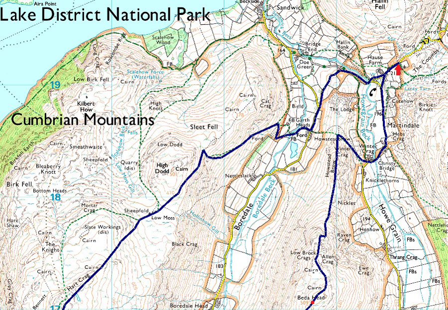 Martindale New Church – Martindale – Winter Crag – Beda Fell – Bedafell Knott – Heckbeck Head – Angletarn Pikes – Boredale Hause – Steel Edge – Place Fell – Low Moss – High Dodd - Garth Head Farm – Martindale New Church |