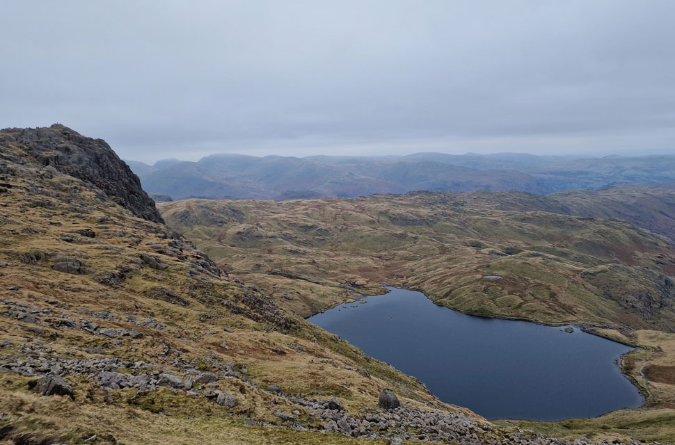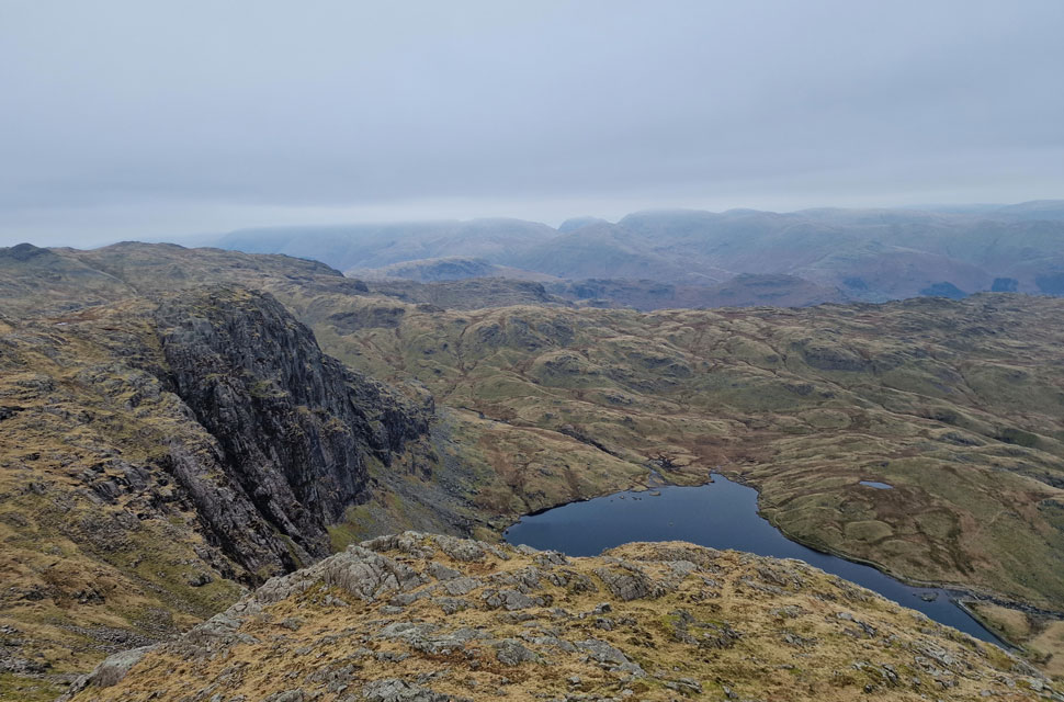 Stickle Tarn, Lingmoor Fell and Great Langdale from Pavey Ark summit. |