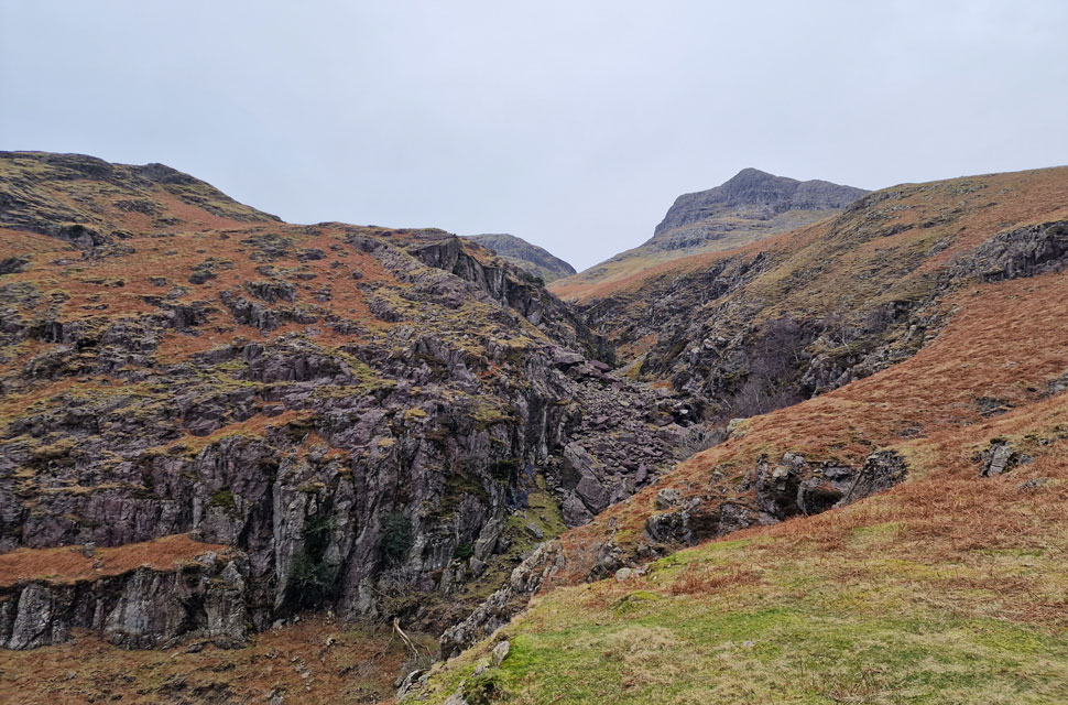 Thorn Crag and Harrison Stickle from Dungeon Ghyll lower ravine. |