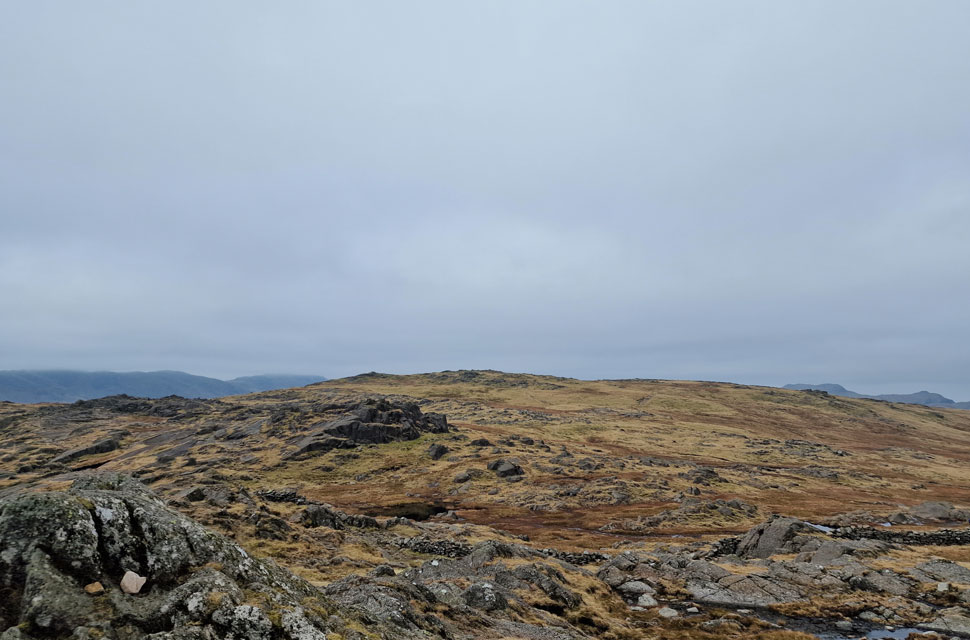 A worn shortcut through withered bracken allowed a direct ascent on Pike Howe where I was able to take in the view over the Langdale Valley. Still no signs of any sunshine. How can the forecasters get it so wrong. |