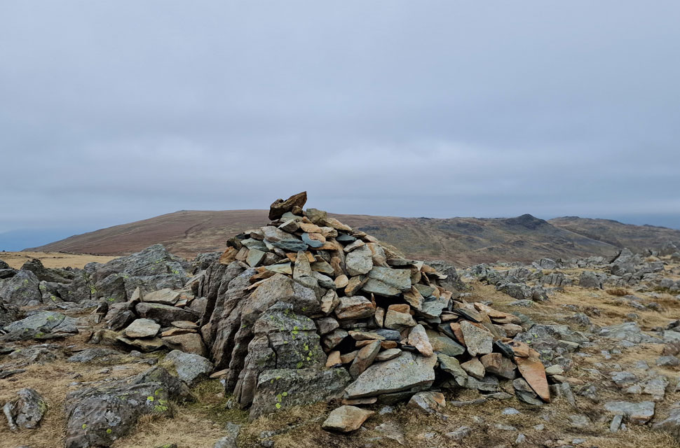 You can just see the path in the centre of the photo, which then traces onto the ridge. In recent times, faint paths have cropped up that also link the summits. The path I used was clearly marked with cairns, just like the one in the foreground. |