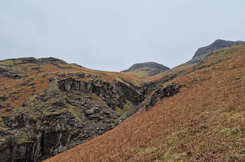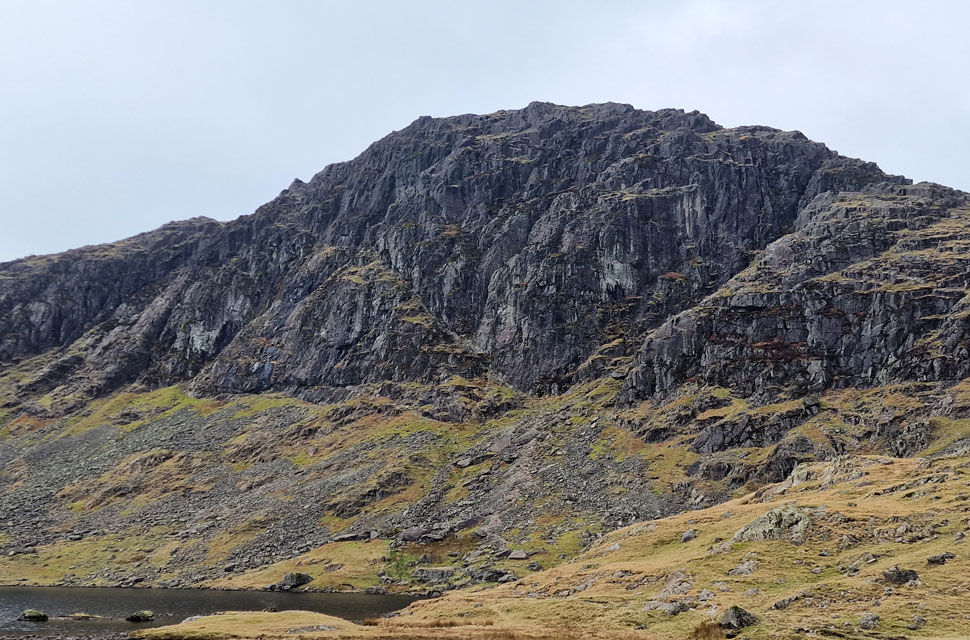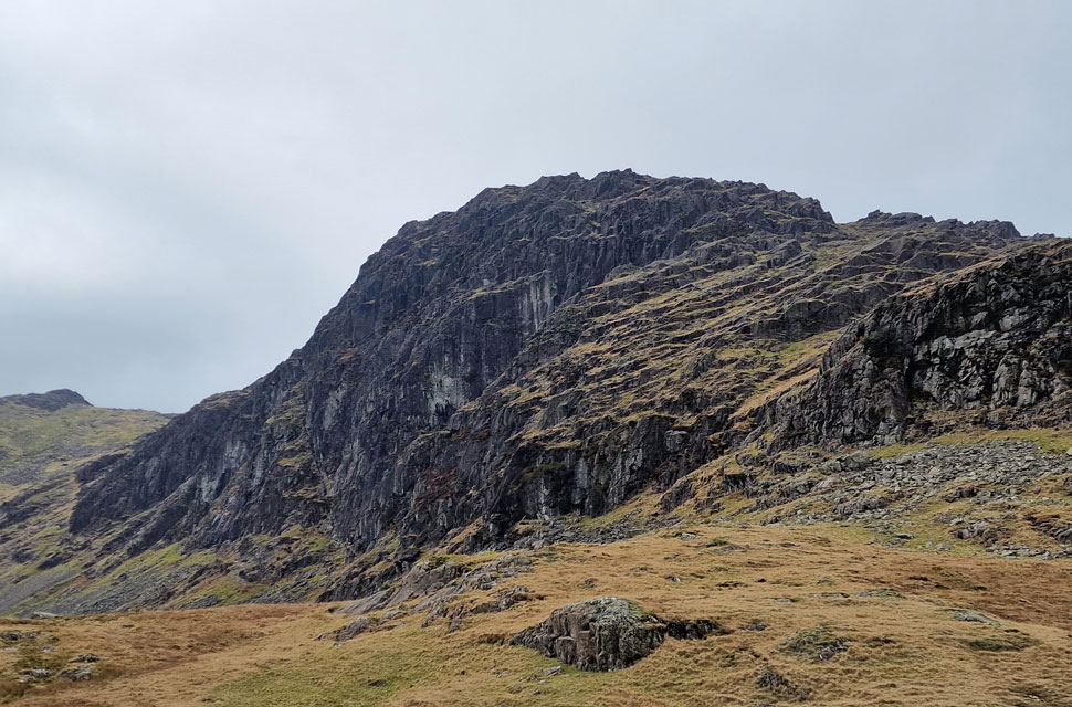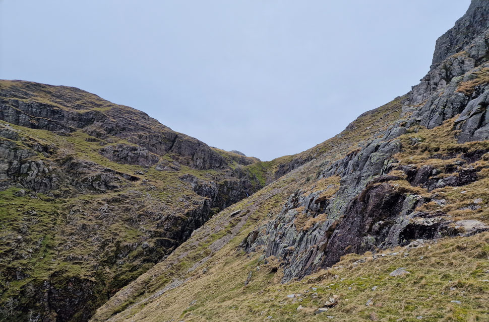 The north gully is Pavey Ark's more common means of ascent and is accessed from the east side of Stickle Tarn. The ascent begins on the other side of the bottom left buttress before accessing the gully at the col seen in the centre. |