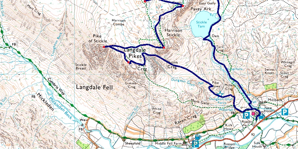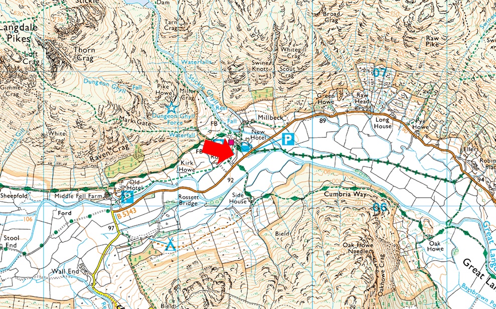 A large National Trust car park can be found at New Dungeon Ghyll with ample parking all year around. There are toilet facilities and of course New Dungeon Ghyll Hotel and Stickle Barn close by.Parking is free for Trust members but charges apply to non members. |