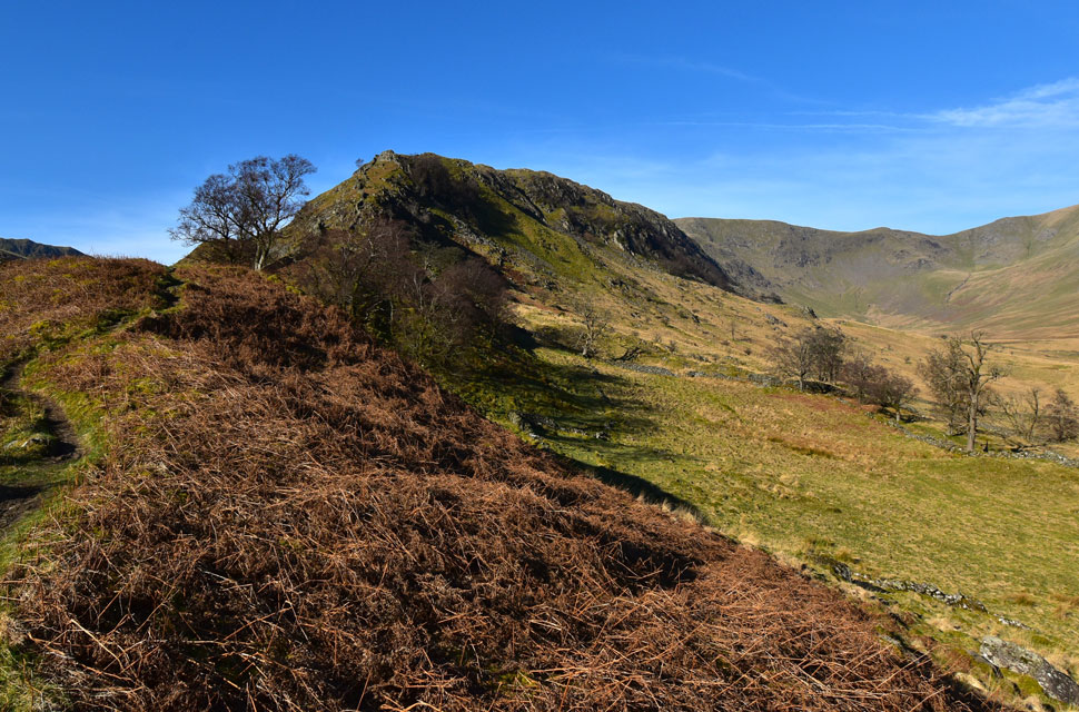 The view into Rampsgill, with Rest Dodd and The Nab seen flanking the valley. |