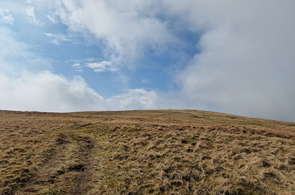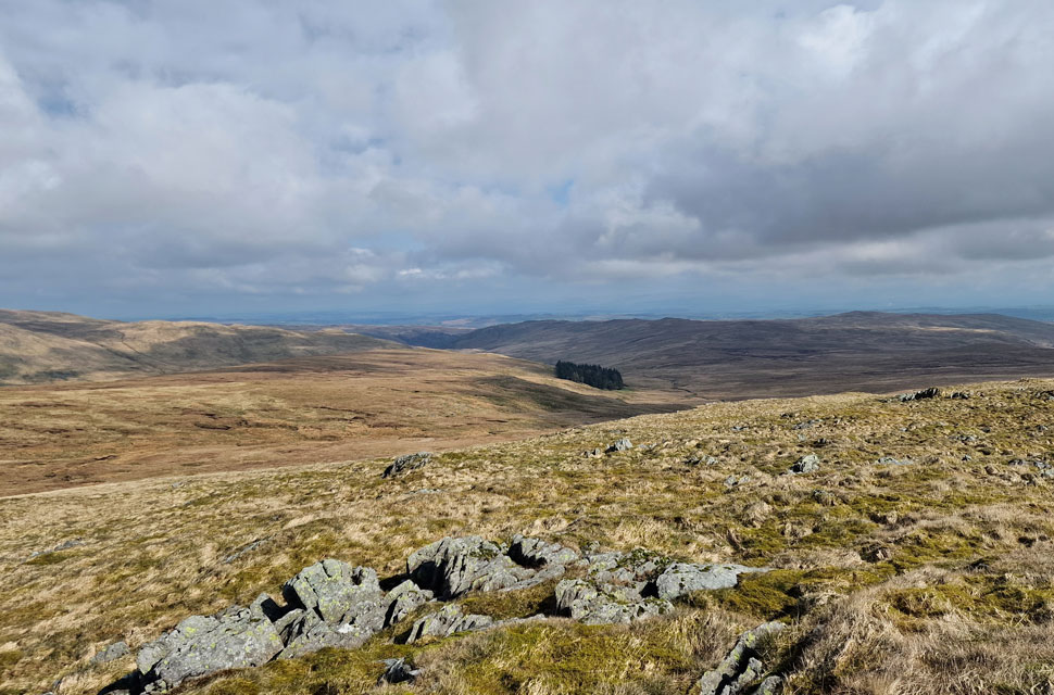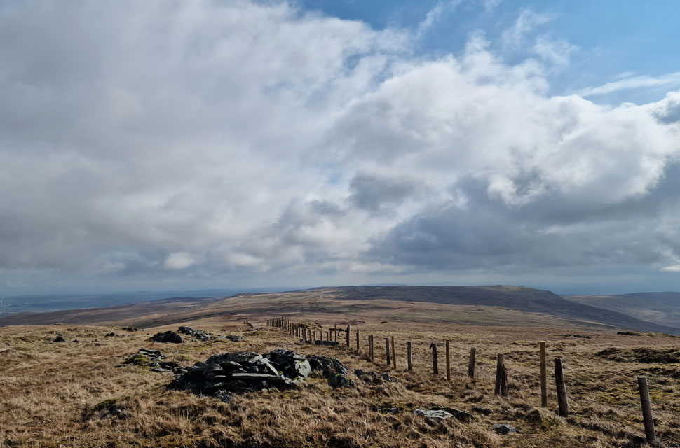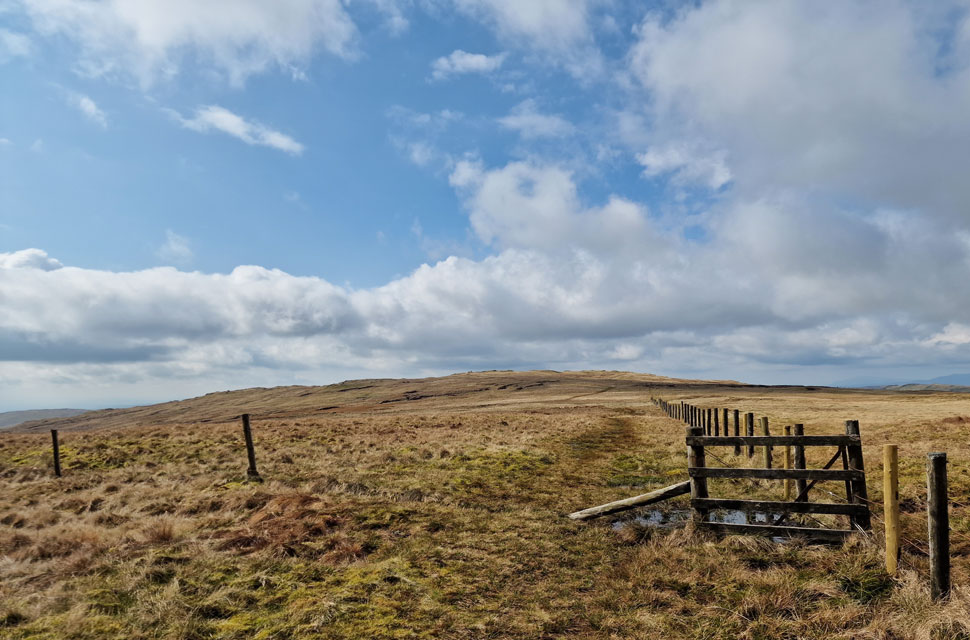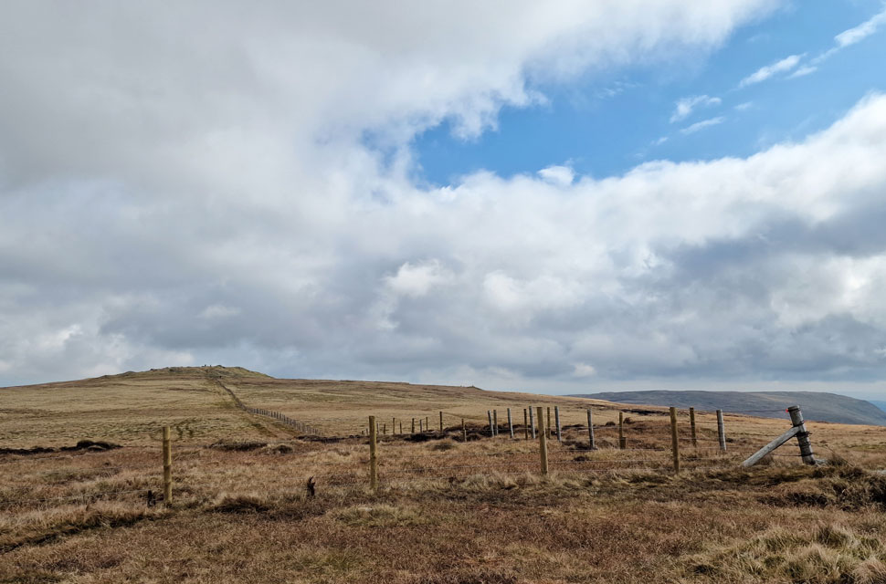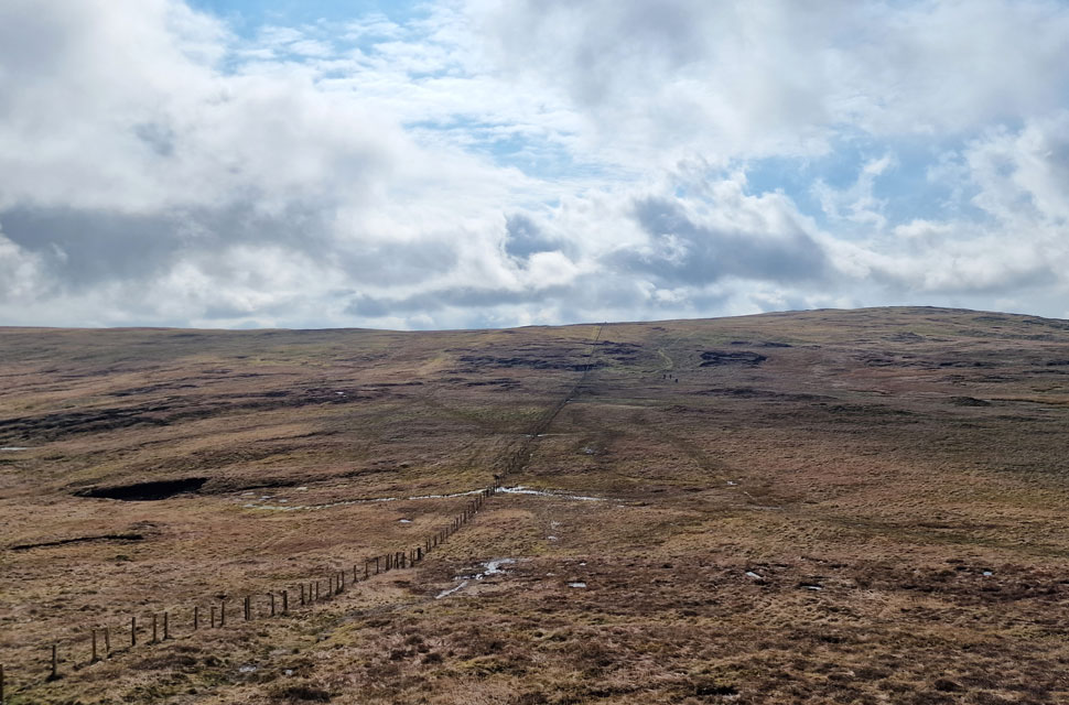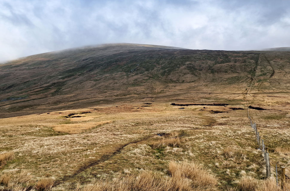 With Brownhowe Bottom behind me, I continued towards the familiar gate, which overlooks the Mosedale Valley, but decided against it after almost losing a boot in the bog. Instead, I made my way over the peat hags and soon arrived at the wire fence which ascends alongside the path almost as far as Grey Crag summit. |
