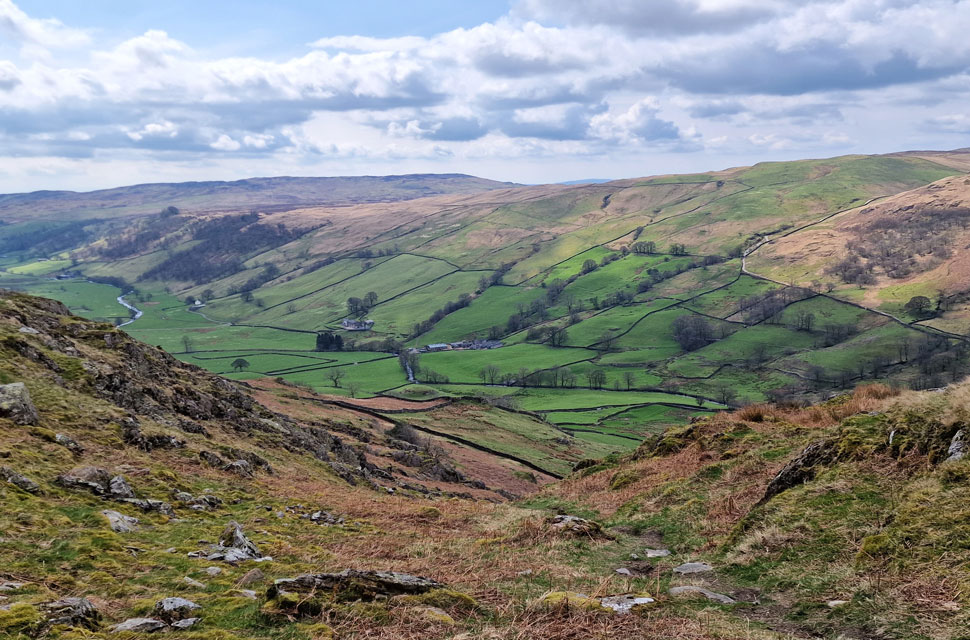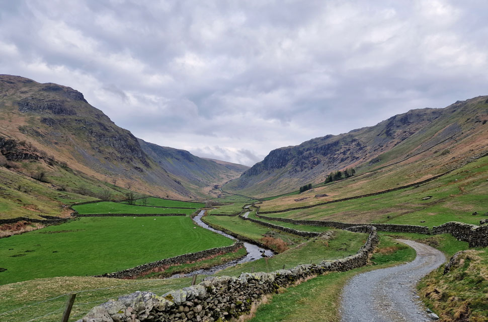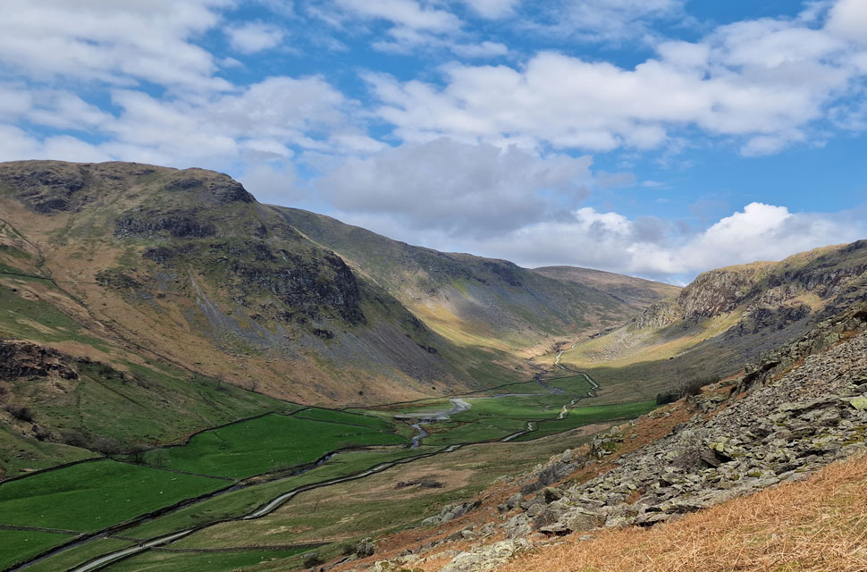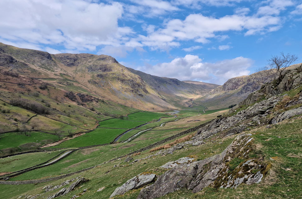 With the gully behind me, all that was left was 150ft of grassy descent, where at times I was lured off path for that 'better view' The trio I'd been tailing had passed from field to track via the gate below before heading towards Sadgill where a few more cars occupied the parking spaces than this morning. It was much milder now, and I was feeling the benefit after taking off my hat and gloves off back on Grey Crag.