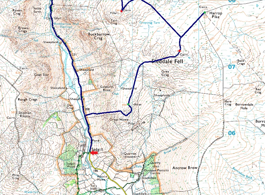 Sadgill Bridge - Longsleddale - Brownhowe Bottom - Tarn Crag (Longsleddale) - Greycrag Tarn - Harrop Pike - Grey Crag - Great Howe - Sadgill Bridge |