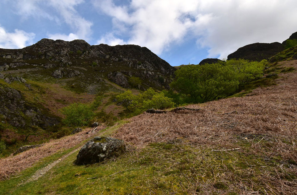 Feeling like I'd forgotten to do something, a quick pat down confirmed I had everything I thought I needed. With the car locked, I passed over a sty and joined the narrow path through Folders Wood, flanked by Hassnesshow Beck to my left and a stone wall to my right. The path steadily rises into sunlight, where Goat Crag dominated the view ahead. |