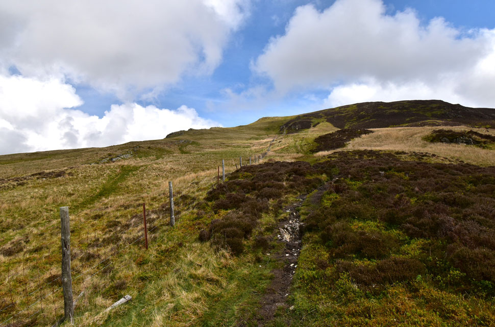 The ascent continues alongside the wire fence, which in places had been streched back in an effort to aid walkers, I was guilty of it too, sometimes you just didn't have the choice, not helped by the ground conditions being soft and clay-like, which often gave way when pressured. With the head of Hassnesshow Beck over to my left, the path narrows into a short gully before arriving onto soft, level grass underfoot. |