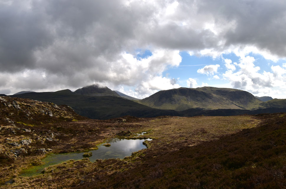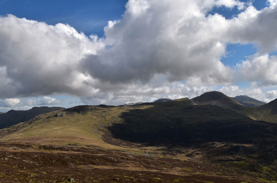 Views over towards Glaramara, Grey Knotts, Brandreth, the Gables, Great End and Scafell Pike. |