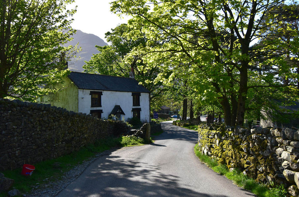 With the descent of Fleetwith Edge almost over I passed over Low Raven Crag and skirted below the Fanny Mercer Memorial cross in its gleaming white paint. The gradient eased onto grassy pasture after which I joined the tarmac of Honister Pass. |