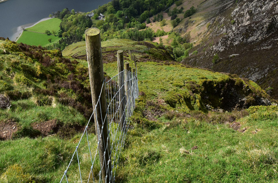 A steep singular path ascends alongside the now ravined Hassnesshow Beck before arriving at a stone wall, where access is gained via a staired gate. By now my lungs were having the workout of a lifetime. The ground was so steep that my walking pole handles were at head height. It is here that I was reminded of how David had said that walkers used the wire fence to pull them up. I hadn't seen any evidence of that yet but I soon will. |
