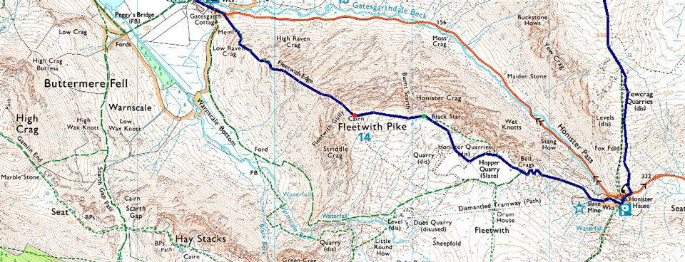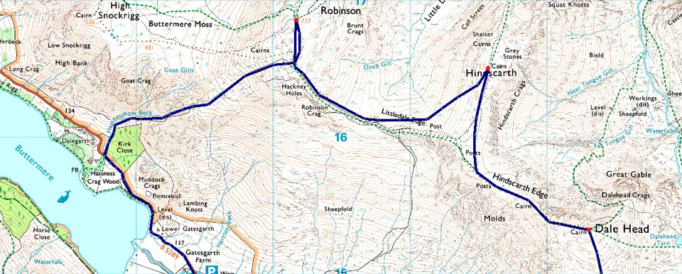 Folders Wood - Hassesshow Beck - Robinson - Littledale Edge - Hindscarth - Hindscarth Edge - Dale Head - Yewcrag Quarry Path - Honister Slate Mine - Honister Quarries - Black Star (Honister Crag) - Fleetwith Pike - Fleetwith Edge - Gatescarth - Folderswood |