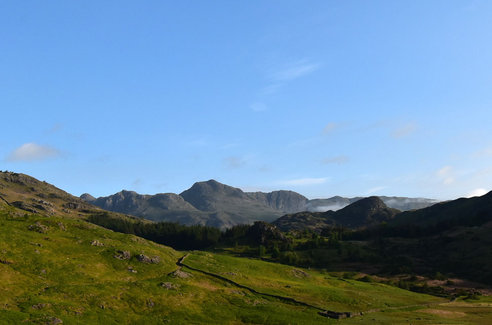 Crinkle Crags and Bow Fell (far left) whose summit is just poking out of the cloud. |