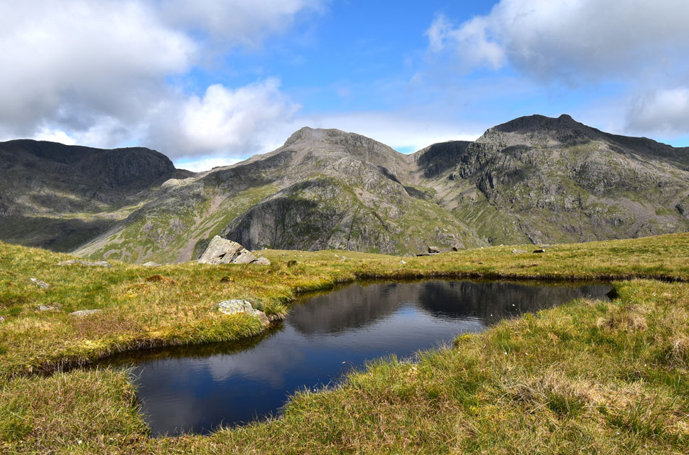 | Here looking out over Great Moss towards Scafell Pike, Esk Buttress, Pen, III Crag, Esk Hause, Esk Pike and Bow Fell. |