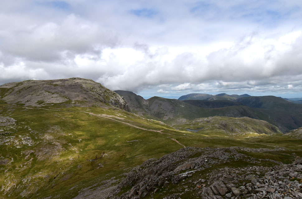 | Moody Scafells and Slight Side from Esk Pike summit. |