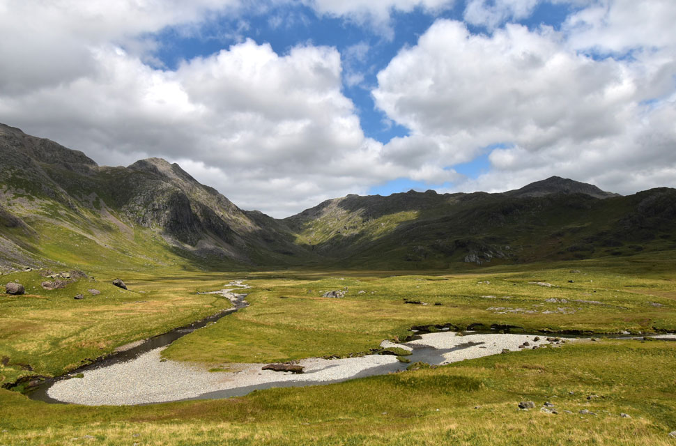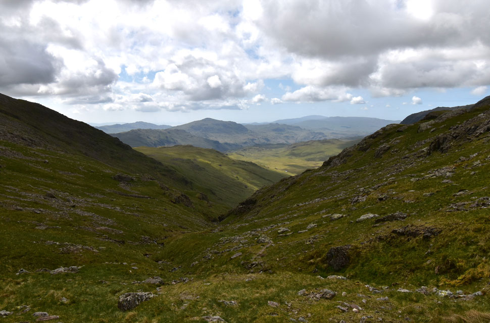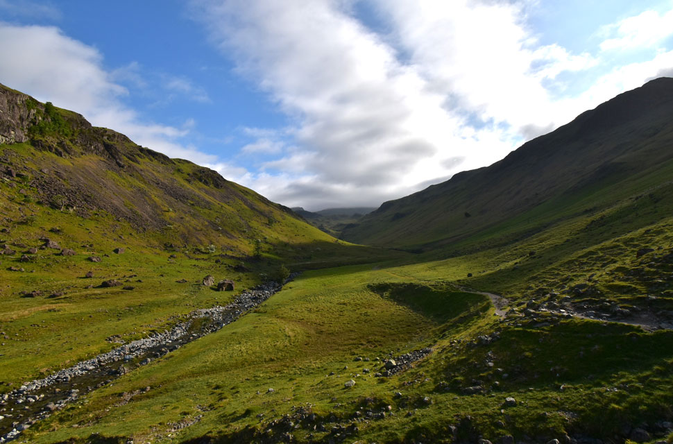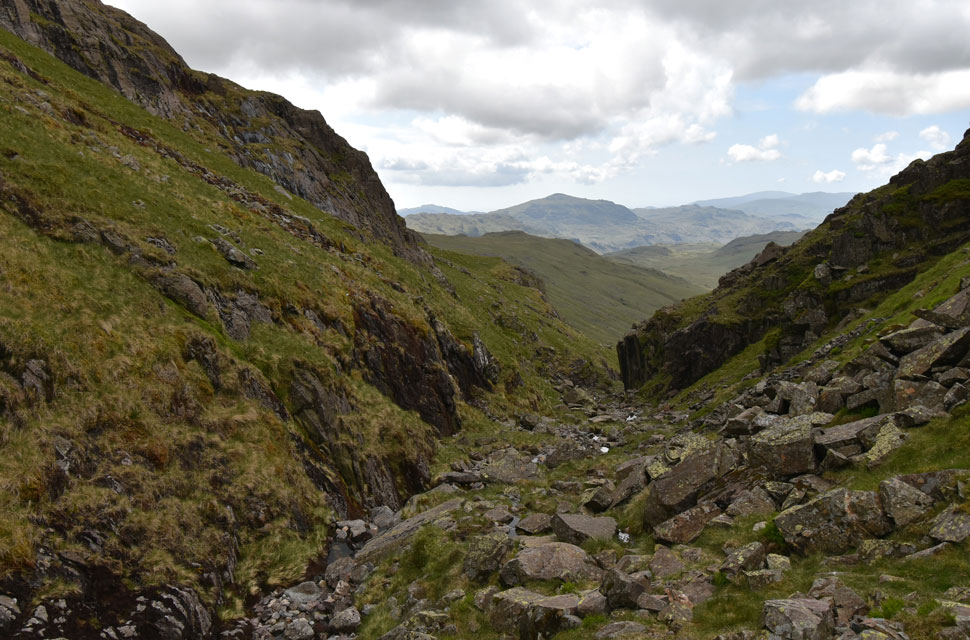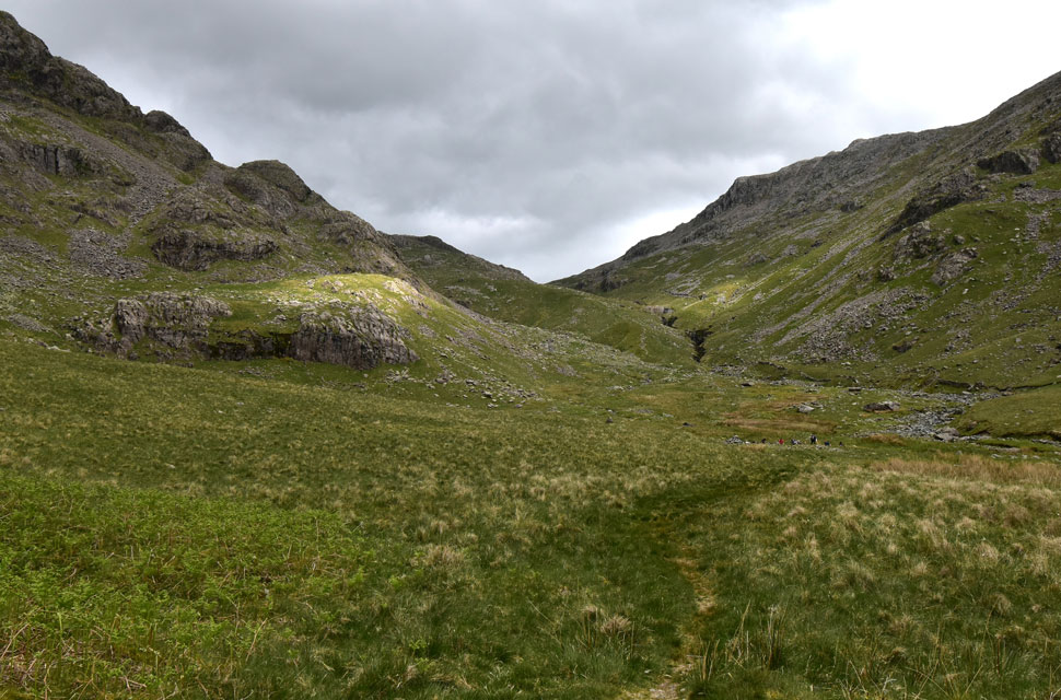 | The ghyll finally widens before a grassy tongue is reached flanked by the mass of III Crag and Cockly Pike to the right. The large group appeared to have stopped about half a mile ahead. |