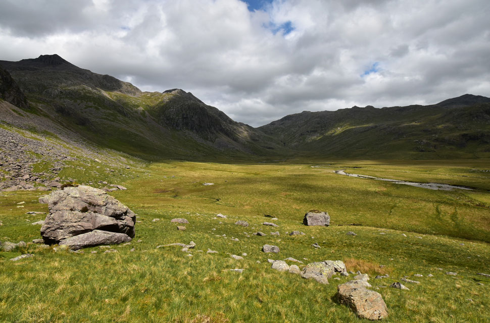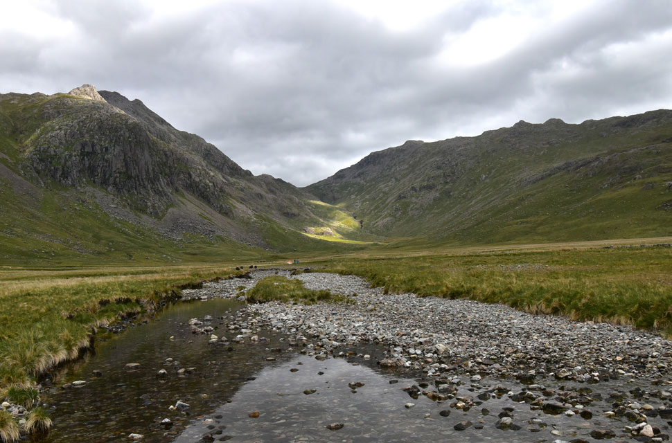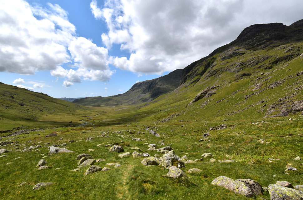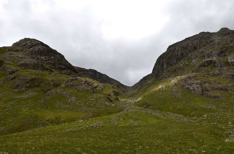 | I took in the slight ascent over Esk Hause then immediately began the descent into Great Moss following the natural line of the ghyll via a path over on the right. |