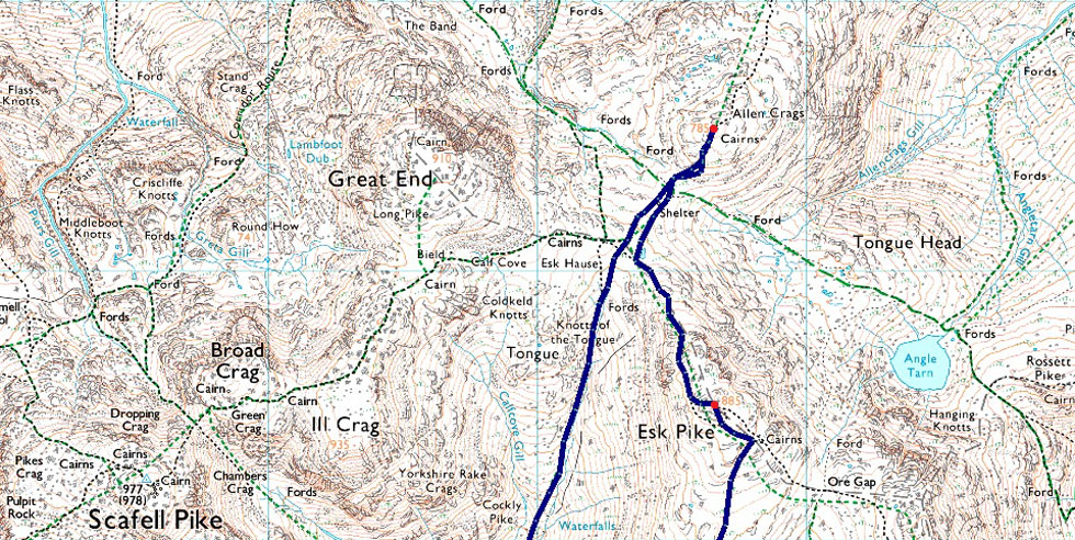 | Cam Spout Crag, Greencove Wyke, Broad Stand, Mickledore, Scafell Pike, Esk Buttress, Pen, Broad Crag and finally III Crag. |