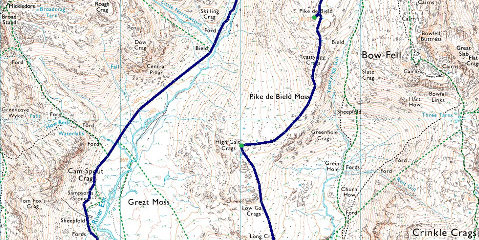 Brotherilkeld - River Esk - Lingcove Bridge - High Gait Crags - Yeastyrigg Crags - Pike de Bield - Esk Pike - Esk Hause - Allen Crags - Esk Hause - Great Moss - Sampson's Stones - Damas Dubs - Cowcove zig-zags - Scale Bridge - Taw House - Brotherilkeld |