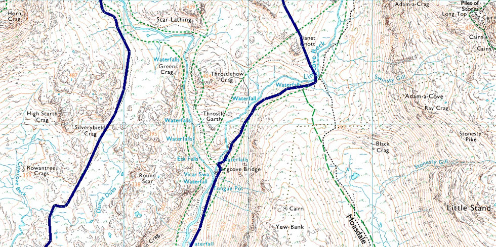 | The outstanding feature is a lengthy south ridge, bounded by the River Esk westwards, and to the east, by Yeastyrigg Gill and Lingcove Beck: a ridge with many abrupt crags. |