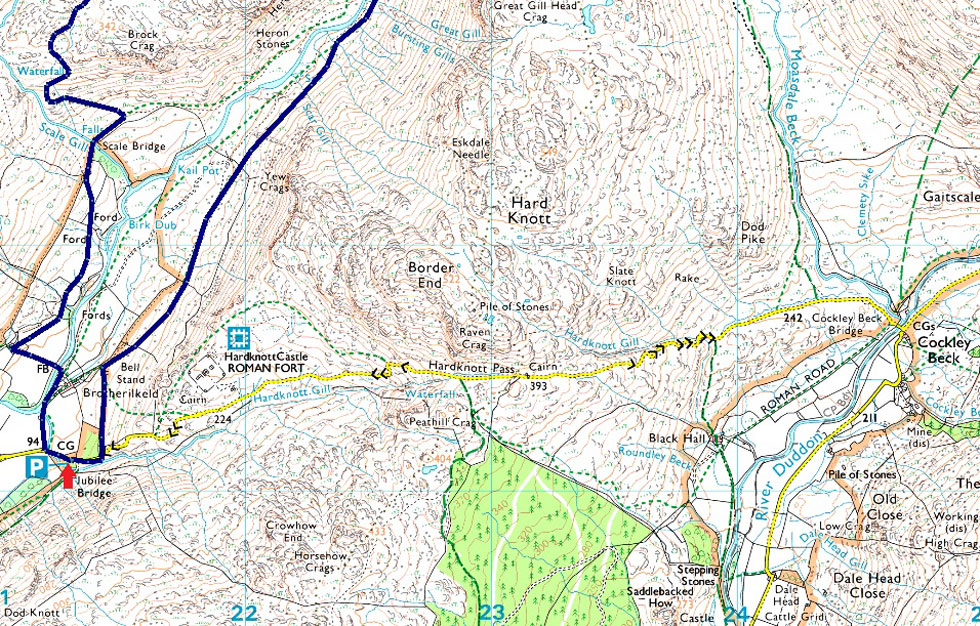 There is room for around eight well parked cars at Jubilee Bridge with further off road spaces found between Jubilee Bridge and Whahouse Bridge. The parking spaces are perfectly postponed to get into upper and lower Eskdale whether you aim for a walk up Harter Fell, Bowfell or the Scafells These spaces during the summer are at a premium, and my advice is to arrive early should you want to secure a parking place. Look out for the cattle grid at the bottom of Hardknott Pass (Jubilee Bridge itself cannot be seen from the road) Parking can be found on the left if approaching from the top of Hardknott Pass or just after the cattle grid on the right if approaching from Eskdale. Parking is free. |