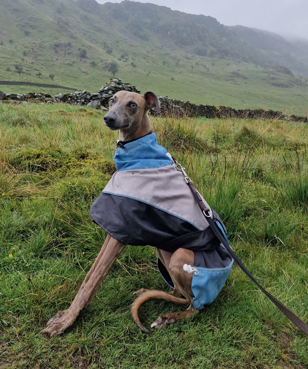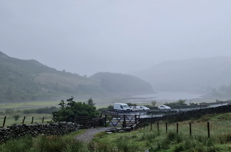 Taking into account the forecast, we had also arranged to meet at the earlier time of 7:30am which meant a 4:30am alarm call for me. Groggy, I left home around 5:20am and arrived at a drizzly Burnbanks around 7:15am where I found David waiting with Calva. I parked at the side of David, and we sent our windows down to save chatting in the rain. The drizzle eased, and we began kitting up just as Rod arrived. Three of us opted for waterproof over trousers while Rod and myself added rain covers to our packs. Just before leaving, we were passed by a friendly dog walker, who unbeknown to us, would be the only person we would see between Burnbanks and Mardale Head. |