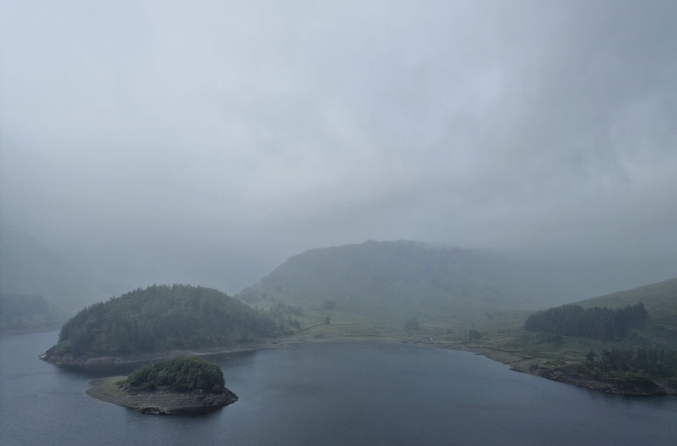 Through the gloom The Rigg and boundary walls from the lost village of Mardale Green. Now below the Reservoir to the left of The Rigg is the area where Holy Trinity Church once stood. |