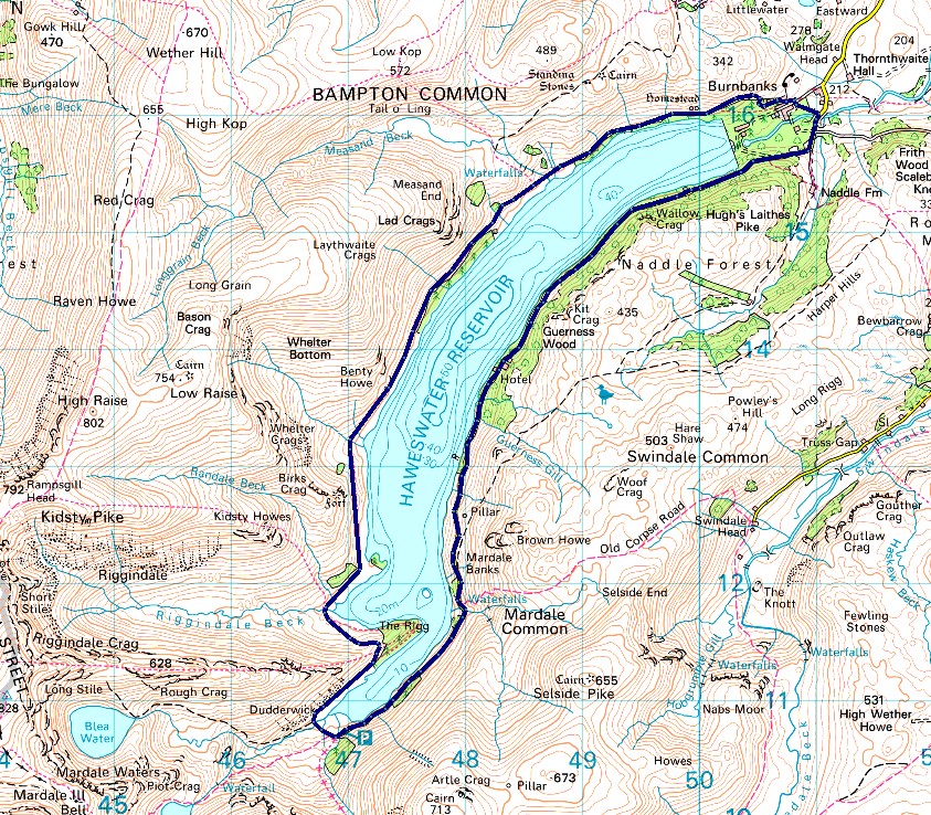 Burnbanks - Haweswater Shore Path - Bowderthwaite Bridge - The Rigg - Mardale Head - Mardale Road - Haweswater Hotel - Naddle Bridge - Burnbanks |