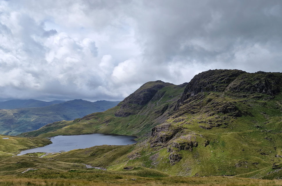 Looking across to Harrison Stickle, Pavey Ark and Stickle Tarn. |