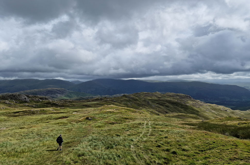 Little did we know this was the last of the sunshine we'd see for the afternoon and it remained uncomfortably muggy. Continuing with our descent, we passed over Greathead Crag, which was where we lost Michael, or Michael lost the path after coming a cropper with his walking pole, resulting in Michael taking a tumble down the fell side. Despite a bruised, grazed, and bloodied knee cap Michael was able to laugh it off thanks to his 'SAS training'