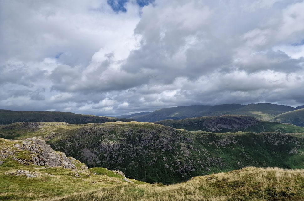 The view over Far Easedale towards Pike of Carrs, Gibson Knott and Steel Fell from Tarn Crag East Ridge. |