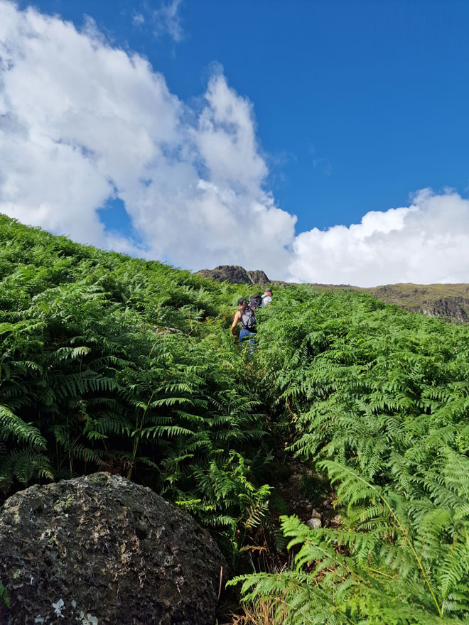 We continued along the shores of Easedale Tarn until we reached the small cairn, where we headed left, bound for Blea Rigg. The path was at first easy to follow but soon strayed through equally high bracken, which tangled at the feet. Here you can just about make out Louise's baseball cap and the back of Rod's bright red rain cover. |