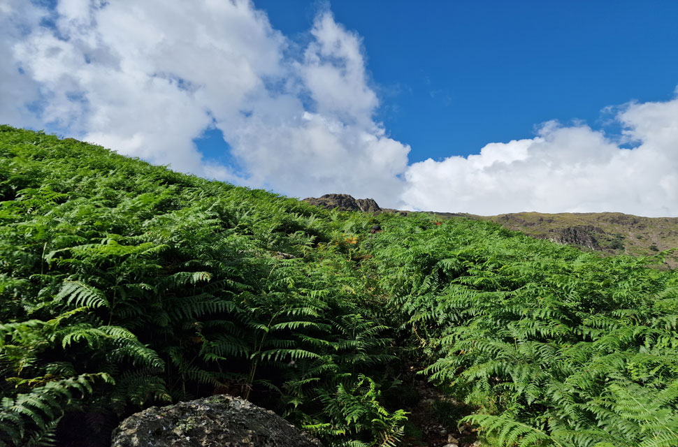 By the time we had reached Easedale Tarn it had clouded over, and we were reminded of our last visit last December, when we spotted skinny dippers swimming in Easedale Tarn which could have gotten a tad embarrassing had they not jumped out and covered up as we neared them. On the opposite side of the tarn I spotted a group heading up Tarn Crag's east ridge who were already up to their shoulders in bracken. |