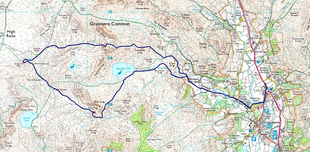 A591 - Butharlyp How - Easedale Road - Goody Bridge - New Bridge - Easedale Tarn - Blea Rigg - Sergeant Man - Codale Head - Tarn Crag (Easedale) - Tarn Crag East Ridge - Far Easedale - New Bridge - Goody Bridge - Butharlyp How - A591 |