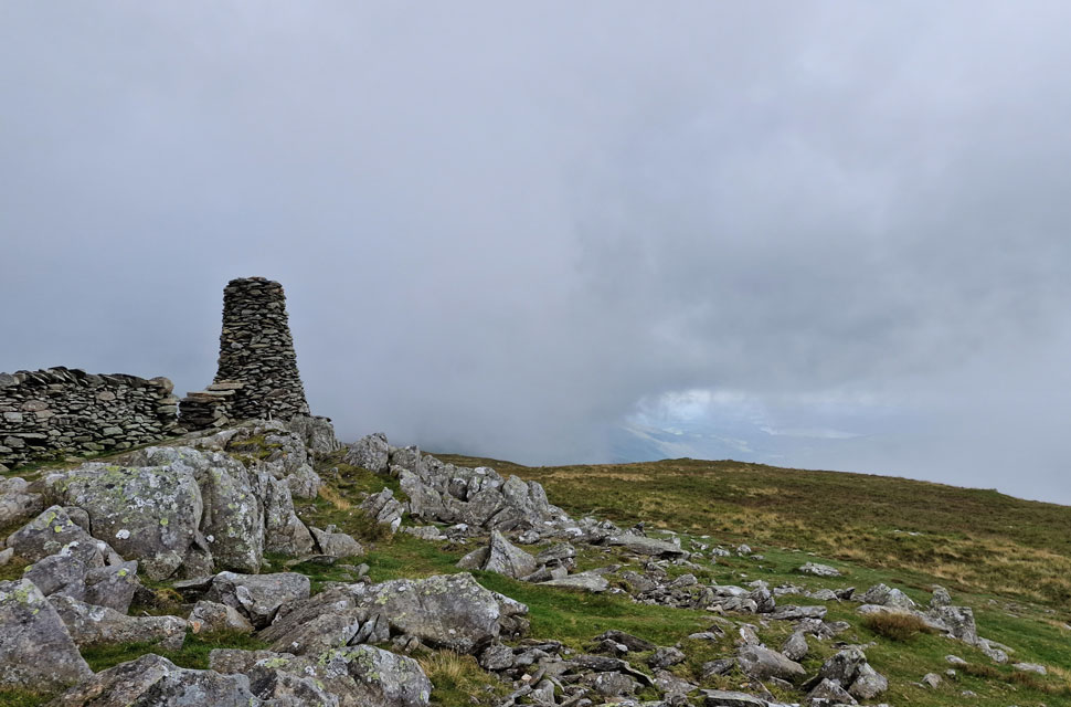 | Two fell runners appeared from Thresthwaite Mouth and stopped for summit photos before heading off in the direction of Gray Crag. We summited next and watched the cloud formations over the Kentmere Valley, which appeared to be breaking up. Let's hope so; we've been in this cloud long enough now. |