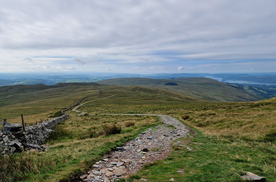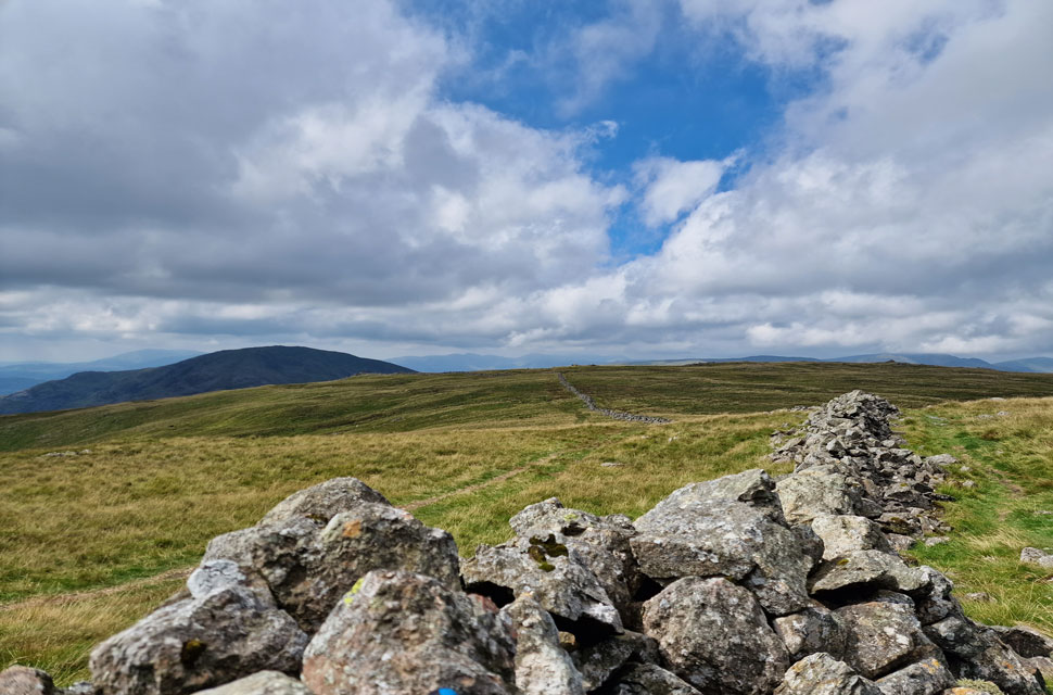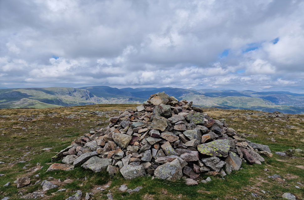 | After lunch, I drained a second bottle of Lucozade before reshouldering packs and making the short walk to Caudale Moor summit, from where views extended towards the Fairfield and Helvellyn ranges, and I wondered if the seagull was still scavenging walkers lunches! |