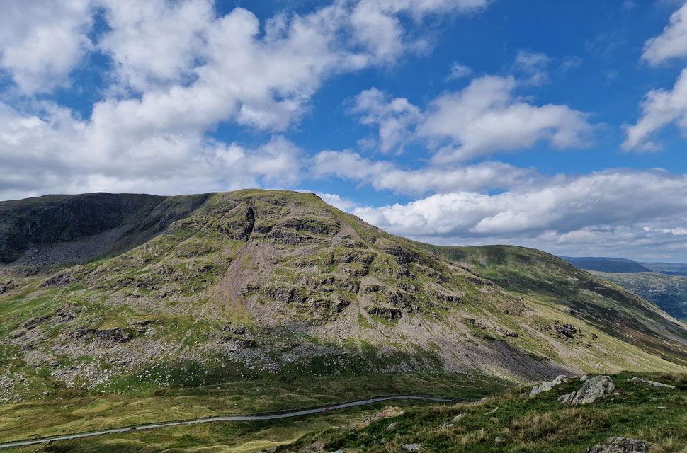 | With views towards Idle Hill, Baystones, and Wansfell Pike. From the road, this looks like a potentially difficult descent, but we found a grassy rake that descended gently all the way to Kirkstone Pass. |