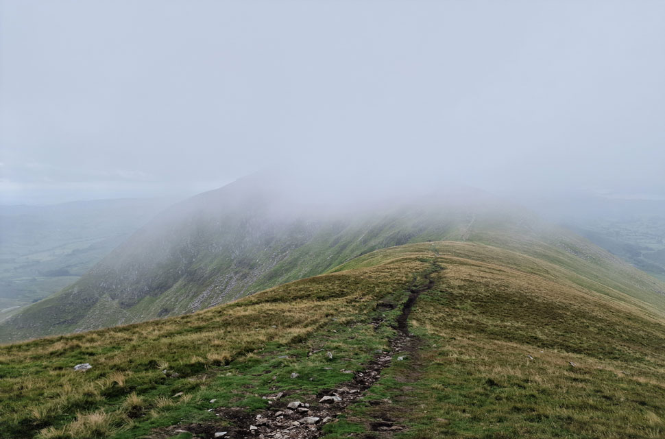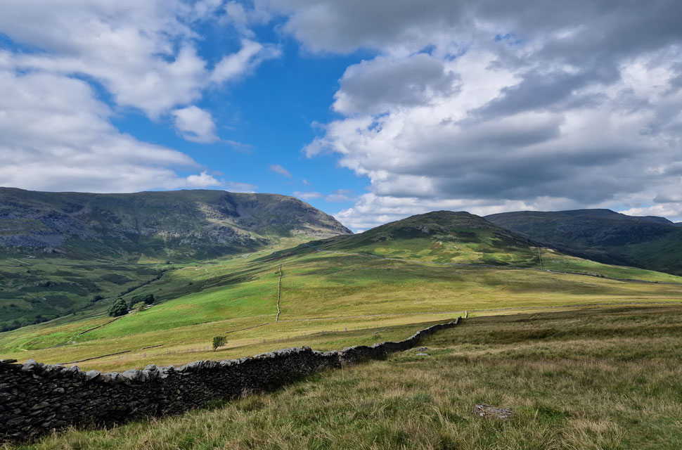 It's almost 4pm and we've been on our feet for almost eight hours, but no one mentions it. Instead, we take in the views beyond the fields and over to the III Bell Ridge, which by now is glowing in the afternoon sunshine. Silence as we continue our descent towards Church Bridge with our cars reached. I look left and notice the hay lying in the field this morning has now been bailed as a Landrover Discovery leaves the field. At a guess, we figured it was the farmer's wife dropping off bate for the farmer. It's exactly 4:10 pm now, and we timed our walk at exactly 8 hours. It's been ages since we have walked so many miles and for this duration. There comes a point in the day when you're normally off the fell and on your way home. At that point, we were on the summit of Caudale Moor with miles still to go. |