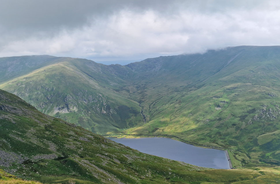 | The view over Rainsborrow Cove towards Kentmere Reservoir, Lingmell End, Mardale III Bell, the top of Nan Bield Pass and Harter Fell. |