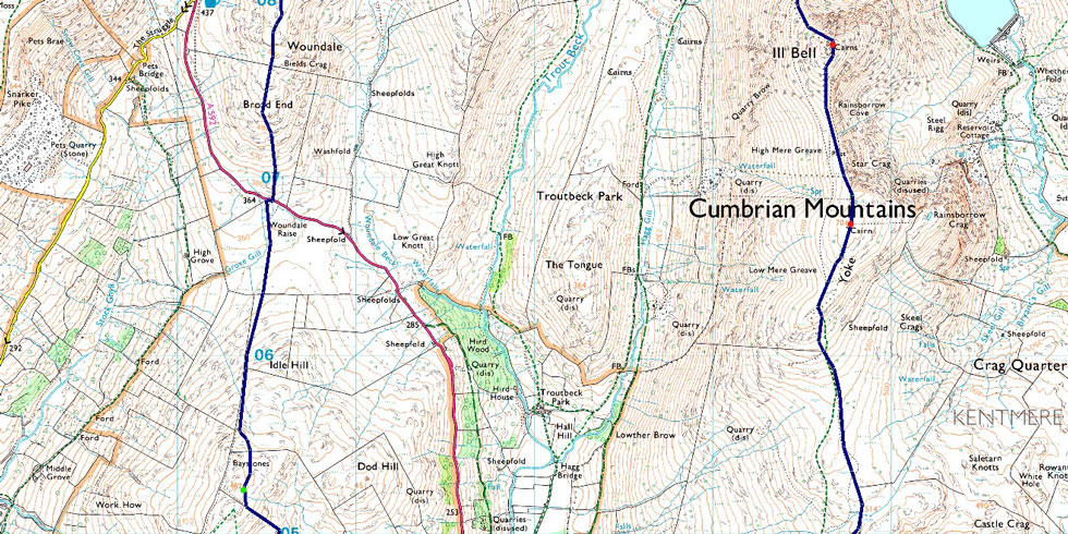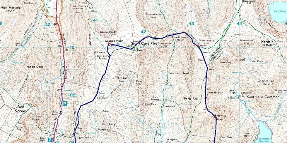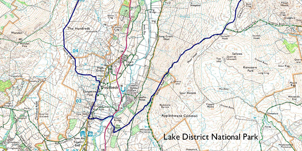 Church Bridge - Garburn Road - Top of Garburn Pass - Yoke - III Bell - Froswick - Thornthwaite Crag - Threshthwaite Mouth - Stony Cove Pike - Caudale Moor - John Bell's Banner - St Raven's Edge - Broad End - Kirkstone Pass - Idle Hill - Baystones - Nanny Lane - Troutbeck - Church Bridge |