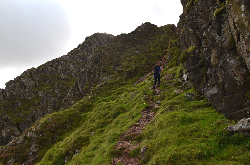 We had the choice of ascending via one of two paths that split below the lower crags; two walkers were already on the right path, so we decided to ascend left between the two sets of crags which would eventually narrow into a gully. |