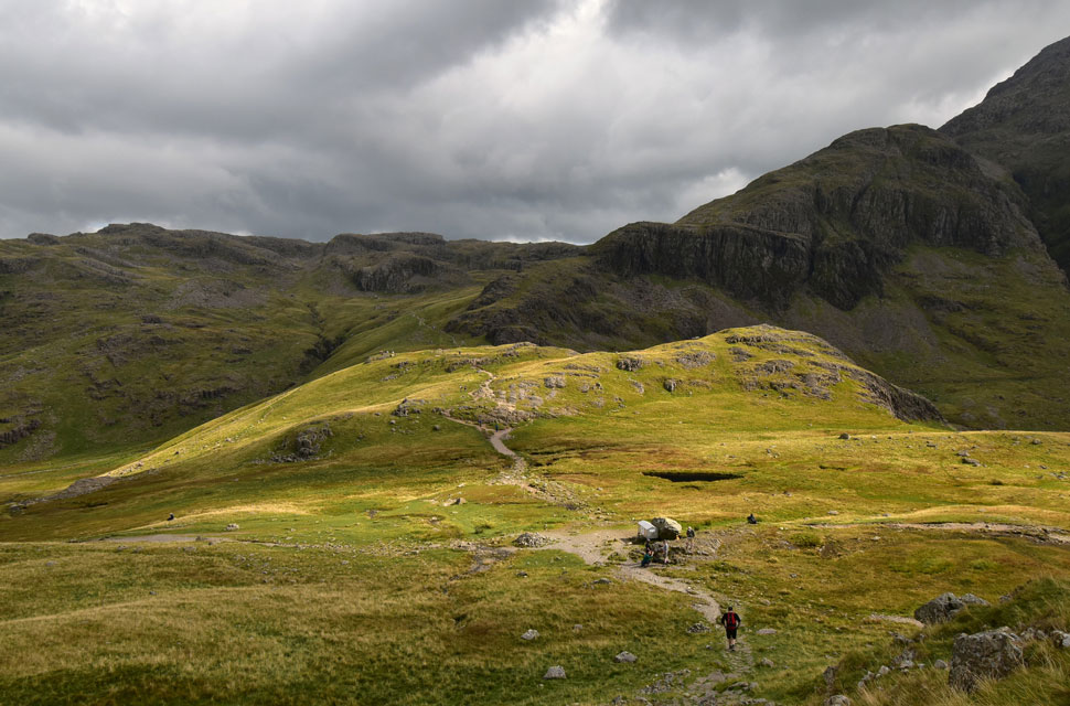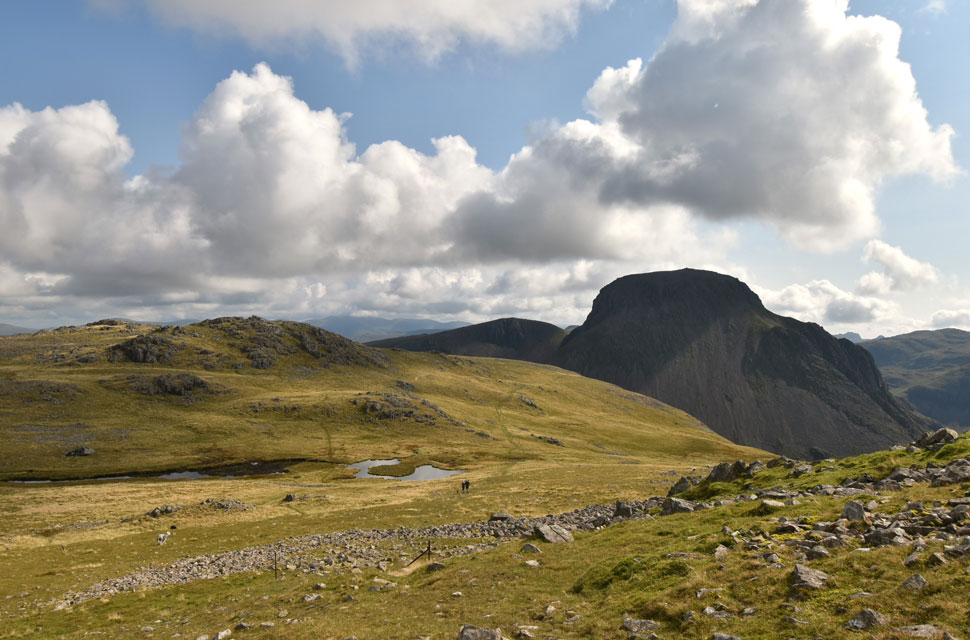 Sty Head with The Band on Great End seen to the right and Seathwaite Fell to the left. |