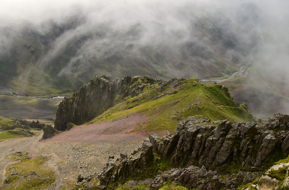 We left the summit and made our way over to the Breast Route while still in the cloud. The path was busy with walkers in descent, three of whom were in a world of their own as we clipped at their heels, ready for a break to pass them; even though they knew we were there, not one of them stepped aside to let the faster descenders pass. |