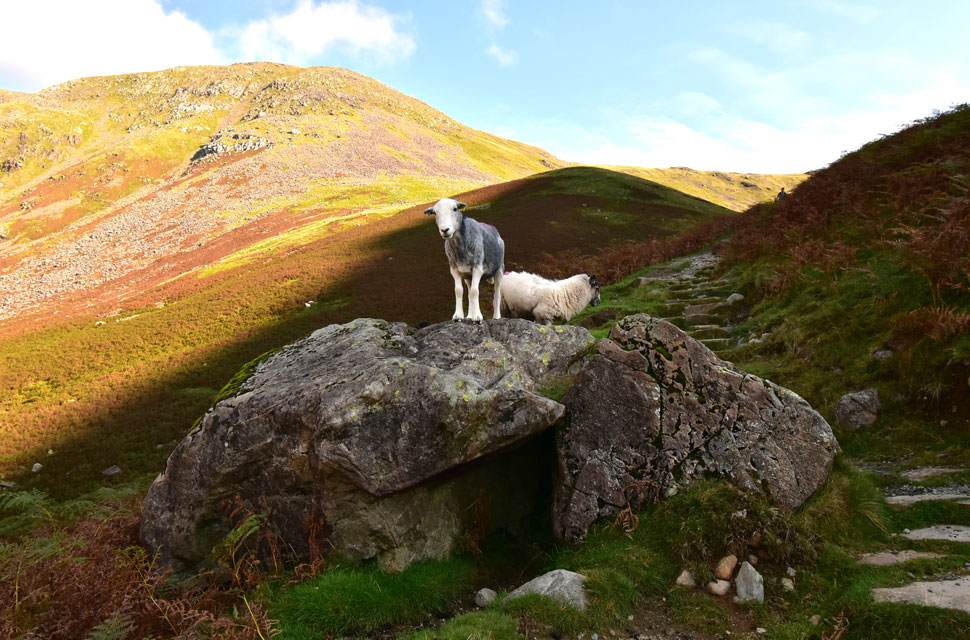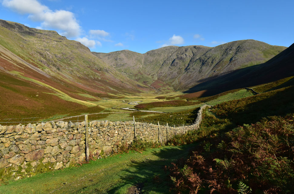 After a few brief moments at Sty Head, we began our descent, which for the most part was rough underfoot, but the cloud drama and light in its wake were enough to take the descent off our minds. We continued with less breeze now which had been replaced by hot sunshine, and no matter how much I drank, I could feel my lips turning gooey through dehydration. Below, Lingmell Beck the plunge pools where hoards of sunbathers and swimmers enjoyed the autumn sunshine as if it were the first day of the summer holidays. With Gable Beck reached, we crossed the footbridge, from where I checked the path on Gavel Neese to see if I could see Andy in descent, but there was no sign of him. Despite the hot sun, we are flanked by bracken on the turn ready for autumn. As we joined the footpath through Burnthwaite Farm, Louise was delighted to spot three hens clucking away.