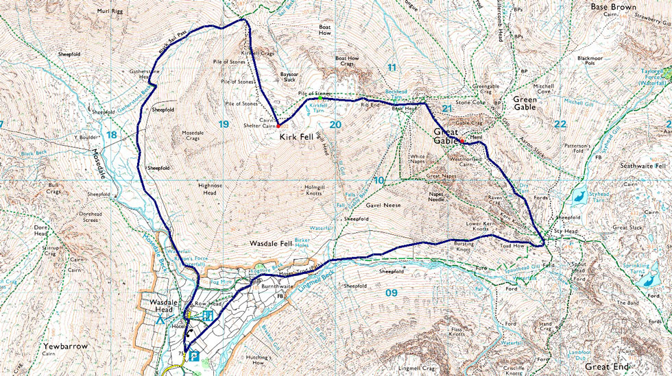 Wasdale Head - Mosedale - Gatherstone Beck - Gatherstone Head - Top of Black Sail Pass - Kirkfell Crags - Kirk Fell - Kirk Fell North Top - Rib End - Beck Head - Great Gable - Breast Route - Sty Head - Moses Trod - Burnthwaite - Wasdale Head |