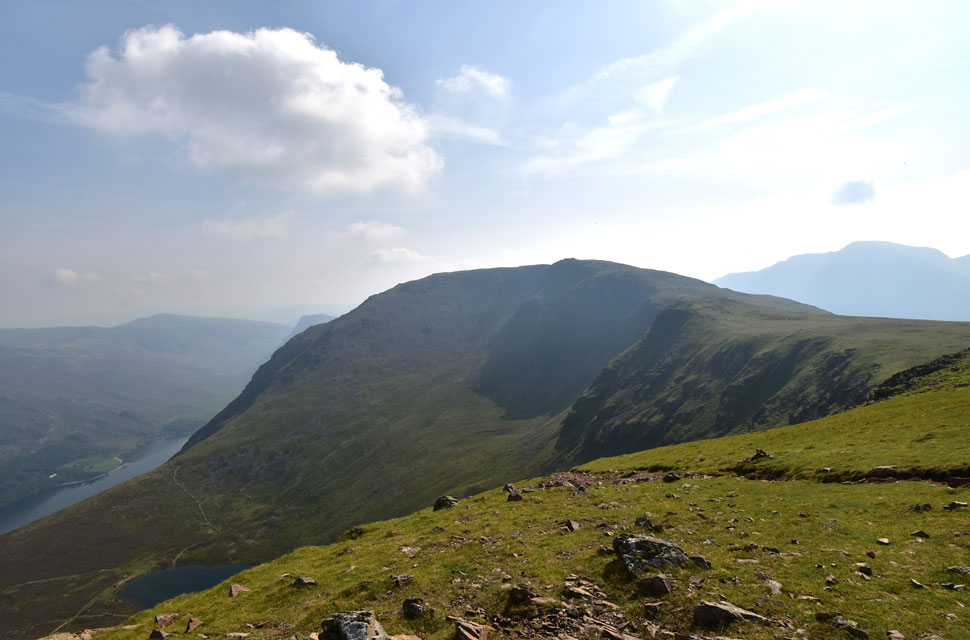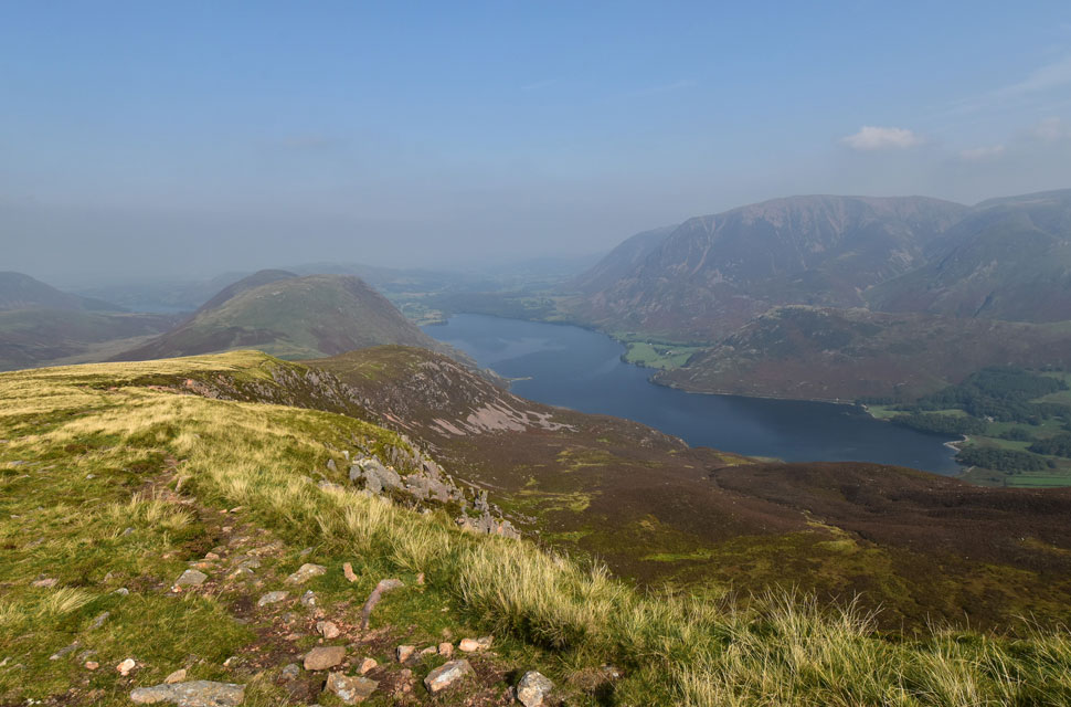 Still feeling a little miffed, I didn't bother to take a photo. I left the summit and began my descent, capturing this lovely view of Crummock Water shimmering through the haze below. It was also here that I spotted a paddle boarder who I'd last seen entering Crummock Water from the Highpark area of the lake. It seemed they were boarding a lap of the lake, and for a split second, I'd have traded places with them. |
