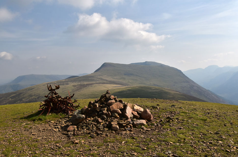 From Mellbreak's north top, I dropped into the saddle, where I was met with the slightest of breezes before the short grassy rise onto the summit. I reached the summit in no time and was miffed to find someone had relocated the summit cairn to a rocky knoll about 120 feet south of the actual summit. Visually, there was no comparison as to which was the higher ground.