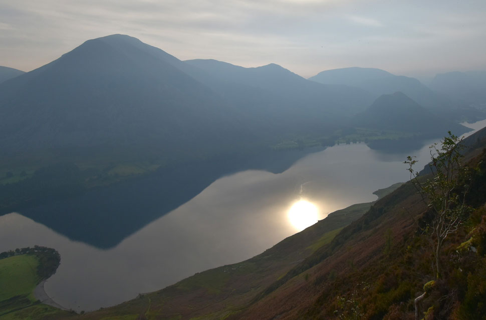That's Green Gable, Great Gable and Kirk Fell seen beyond the Ennerdale valley which is still trapped in haze. |