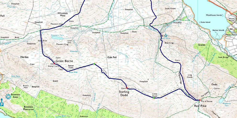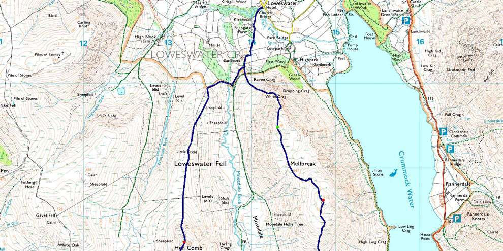Loweswater – Kirkgate Farm – White Crag – Mellbreak – Scale Force – Lingcomb Edge – Red Pike (Buttermere) – Little Dodd – Starling Dodd – Gale Fell - Scaw Well – Great Borne – Steel Brow – Floutern Tarn – Whiteoak Moss – Hen Comb - Mosedale Beck – Kirkgate Farm – Loweswater |